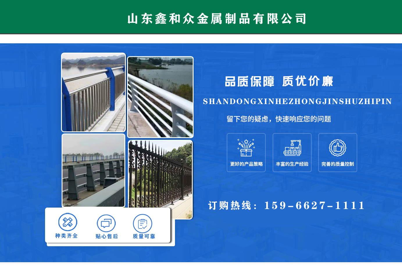山東鑫和眾金屬制品有限公司主要產(chǎn)品有防撞護欄,橋梁護欄,道路護欄,河道護欄,不銹鋼護欄等護欄。提供設(shè)計方案,一站式定制,包您滿意價格優(yōu)惠,歡迎來電咨詢!    公司常年從事銷售護欄防撞護欄,橋梁護欄,道路護欄,河道護欄,不銹鋼護欄,橋梁鋼護欄,河道燈光護欄等。產(chǎn)品廣泛應(yīng)用于橋梁、河道、旅游景區(qū)、道路、公路、公園、小區(qū)、景觀、道路防撞等領(lǐng)域。    公司產(chǎn)品均采用優(yōu)質(zhì)不銹鋼材料,符合相關(guān)標(biāo)準(zhǔn)。各種型號不銹鋼復(fù)合管及護欄,質(zhì)量嚴格把控。產(chǎn)品強度高、耐腐蝕、焊接牢固、抗沖擊、性能好,防撞護欄結(jié)構(gòu)簡單、美觀實用大方。     歡迎前來訂購!...